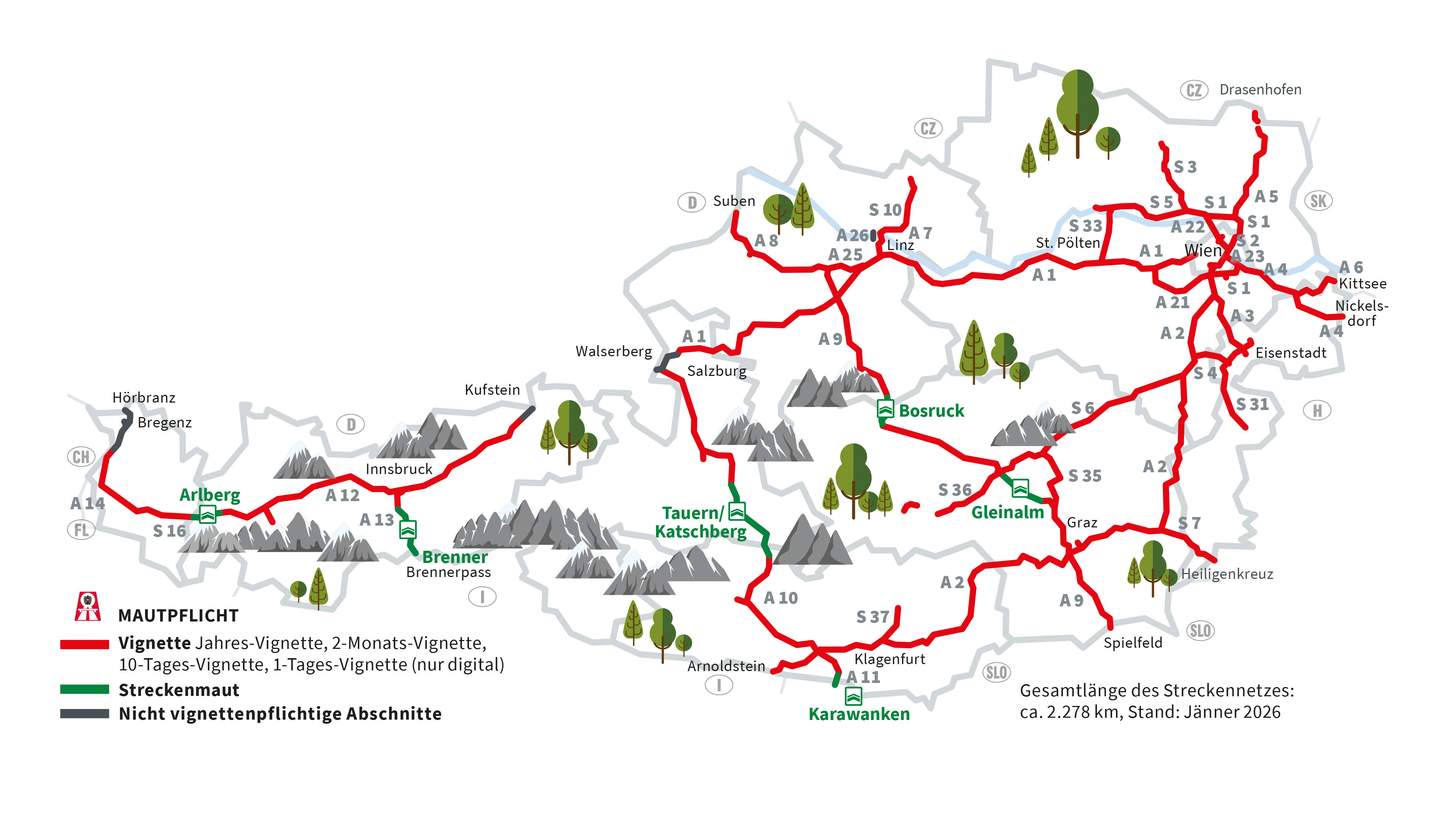 Für einige Tunnel und Alpenüberfahrten (z. B. Brenner, Tauern, Karawanken) wird zusätzlich eine Streckenmaut erhoben.